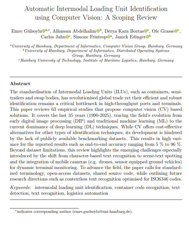 The standardisation of Intermodal Loading Units (ILUs), such as containers, semitrailers and swap bodies, has revolutionised global trade yet their efficient and robust identification remains a critical bottleneck in high-throughput ports and terminals. This paper reviews 63 empirical studies that propose computer vision (CV) based solutions. It covers the last 35 years (1990-2025), tracing the field’s evolution from early digital image processing (DIP) and traditional machine learning (ML) to the current dominance of deep learning (DL) techniques. While CV offers cost-effective alternatives for other types of identification techniques, its development is hindered by the lack of publicly available benchmarking datasets. This results in high variance for the reported results such as end-to-end accuracy ranging from 5 % to 96 %. Beyond dataset limitations, this review highlights the emerging challenges especially introduced by the shift from character-based text recognition to scene-text spotting and the integration of mobile cameras (e.g. drones, sensor equipped ground vehicles) for dynamic terminal monitoring. To advance the field, the paper calls for standardised terminology, open-access datasets, shared source code, while outlining future research directions such as contextless text recognition optimised for ISO6346 codes.