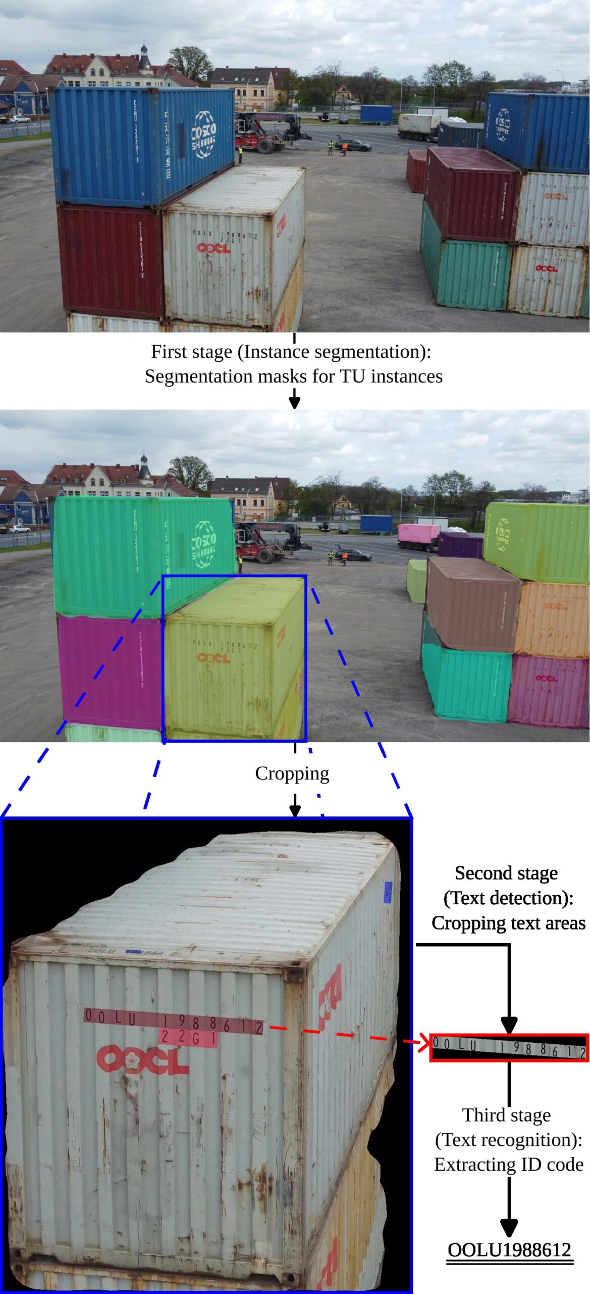 This study presents a framework for inland ports that uses unmanned aerial vehicle (UAV)-based imaging, and reach stacker sensor data including a camera to monitor port operations. A three-stage identification pipeline detects transportation units (TUs) as the first stage, then markings of detected TUs such as ISO6436 compliant ID codes are detected as the second stage. Finally, a text recognition model extracts their IDs.